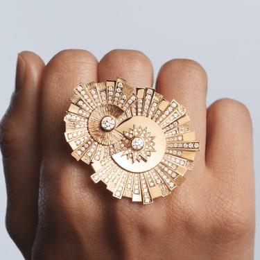 這款玫瑰金鑽石指環流光溢彩,而且充滿活力,散發無與倫比的光芒。此女士鑽石指環結合兩個太陽,向這個恆星在世界各地日出日落的無盡之旅致意。金質太陽光線綴以鑽石,以及品牌經典的Decor Palace(宮廷式裝飾)鐫刻,呈不同長度及高低的排列,並由鑽石中心向外綻放,令作品更明亮、更有層次感。感受此奢華玫瑰金指環的璀燦光芒。